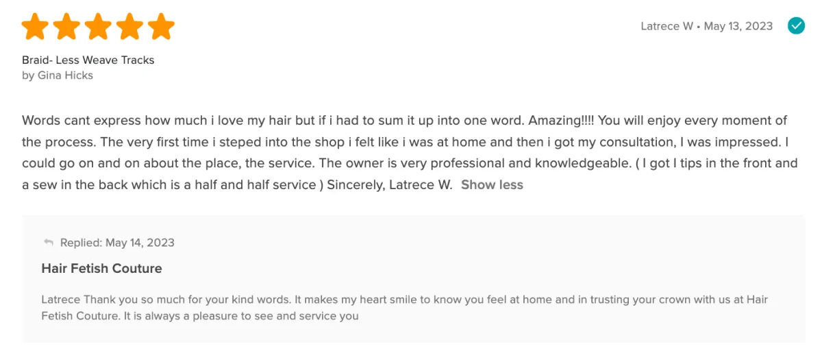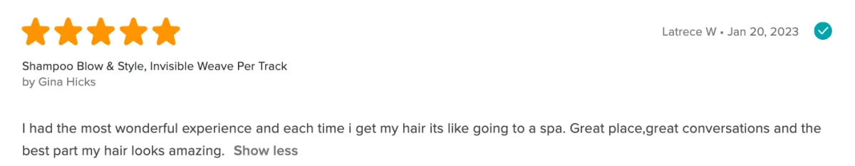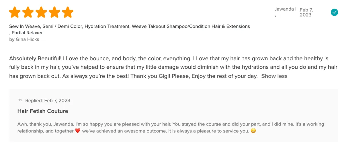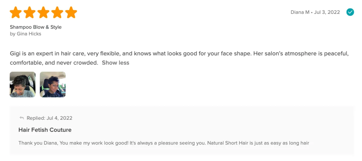 The atmosphere was nice. Gigi did a good job on my hair. I didnt want to get my ends clipped but she walked me through it and educated me on it. Not only that she let me see and know what she was doing the whole time. I appreciate that and I will most definitely be back.