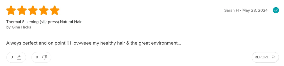 The atmosphere is peaceful....Gina is very professional and she really listen to her clients as well as give us knowledge on how to maintain healthy hair. I do recommend all that knows me to give her a try.